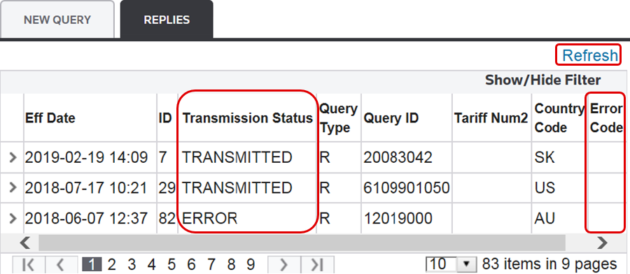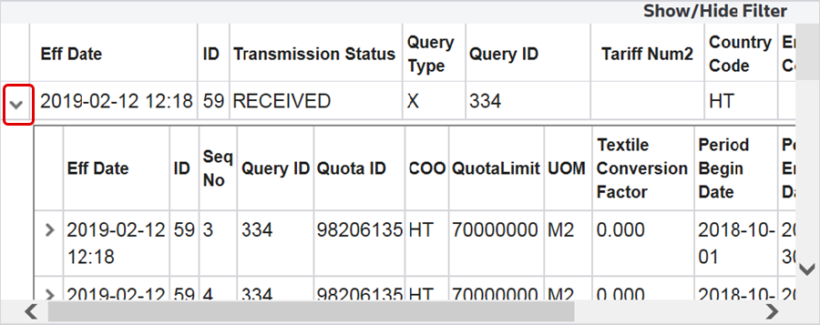 To view more details on a CBP reply, select a reply from the grid and click its corresponding arrow on the far left. Further details will appear in a table below.