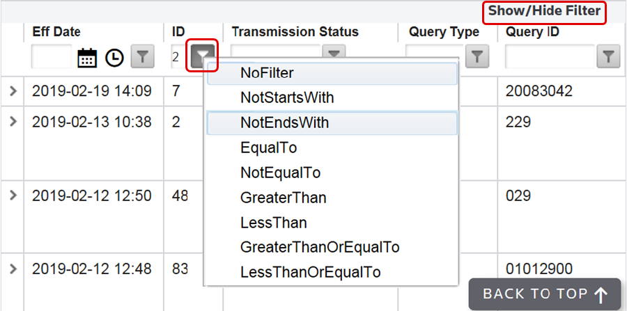 Select a column header to sort by, enter a desired value, and click the filter button. Select a filter (for example,