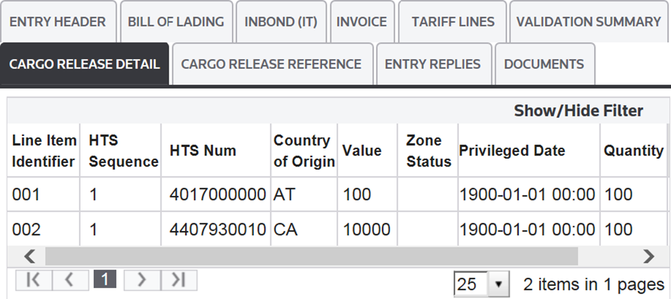 tab displays an overview of an Entry’s CF3461 Cargo release lines.