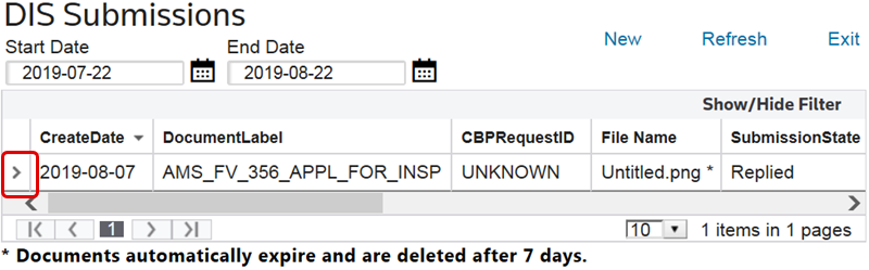 To view the submission status of a document sent to Customs, select a document from the grid and click its corresponding arrow on the far left.
