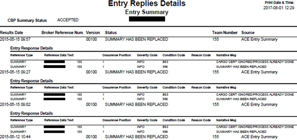 Report will appear when documents are generated and after an entry has been received. This report displays the CBP Summary Status as well as response details for each line on the entry submitted.