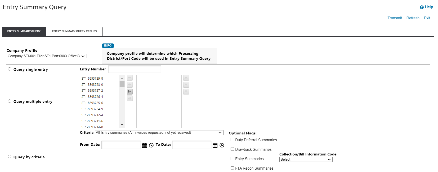 By clicking this dropdown, you can select a specific company profile to indicate which processing district or port code will be used when transmitting.