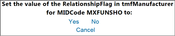 The following pop-up window will appear, asking to set the value for the Relationship Flag in the Manufacturer table for the specified MID. Click