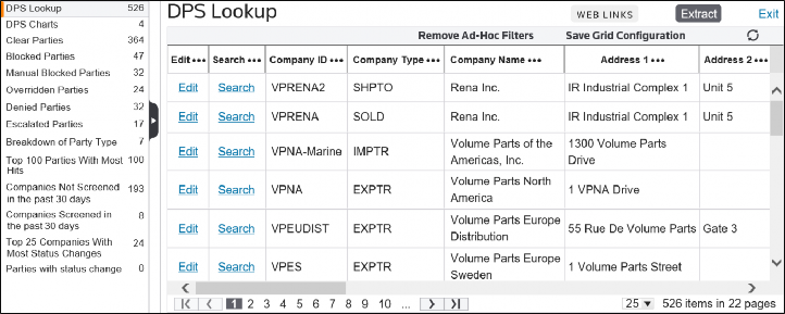 screen displays company and screening records in various categories, all in one screen. This is useful for viewing not only how many companies exist in a group, but also which companies and entities may require attention.