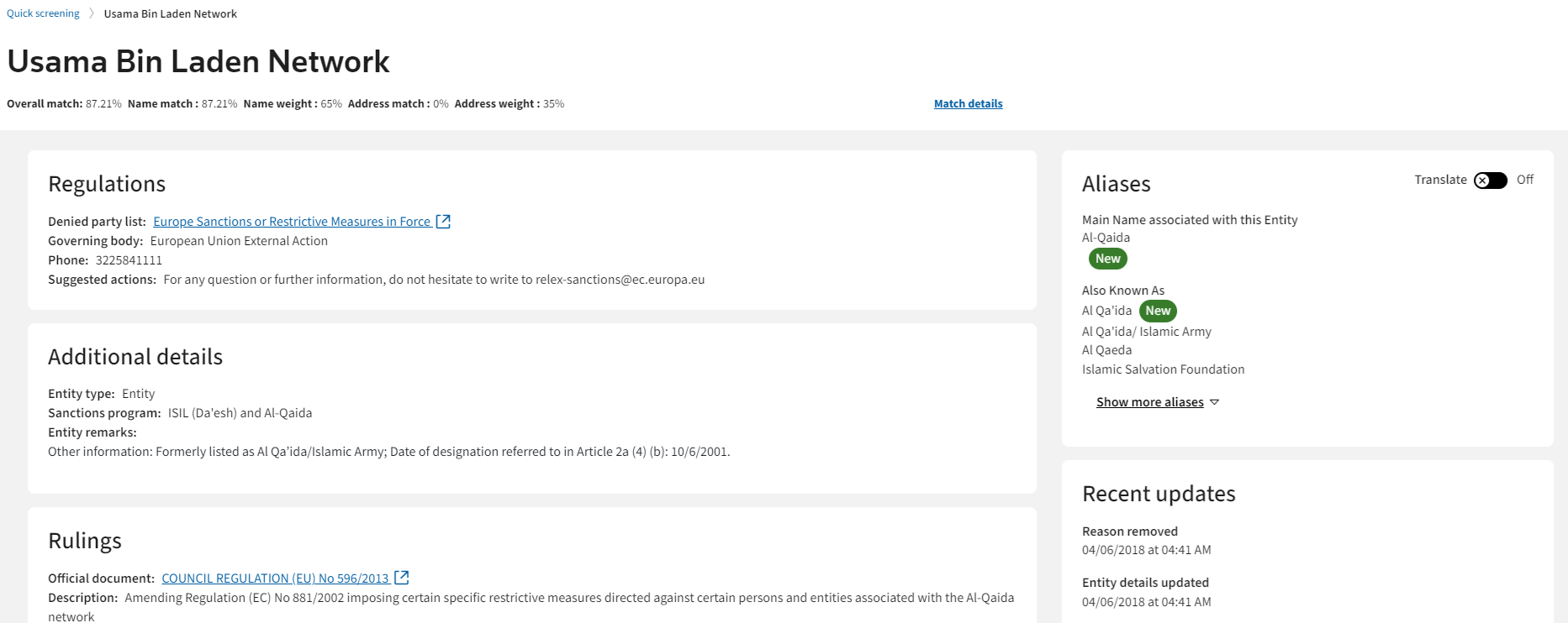 This section contains the name of the country or region of the matched sanction. In case of names in foreign language, you can translate data to your preferred language, by clicking the Translate toggle button, to better comprehend the names. |