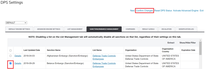 1. Uncheck the sanction/embargo’s box on the far left