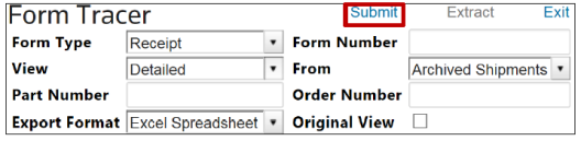 menu. The Form Tracer generates two types of reports: Shipments or Receipts.