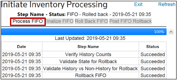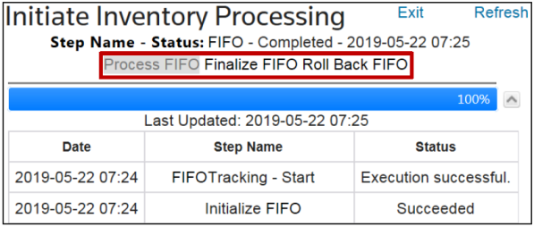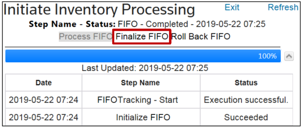 Once all transactions are validated, assigned, and FIFO has processed successfully, the screen will update with a message showing