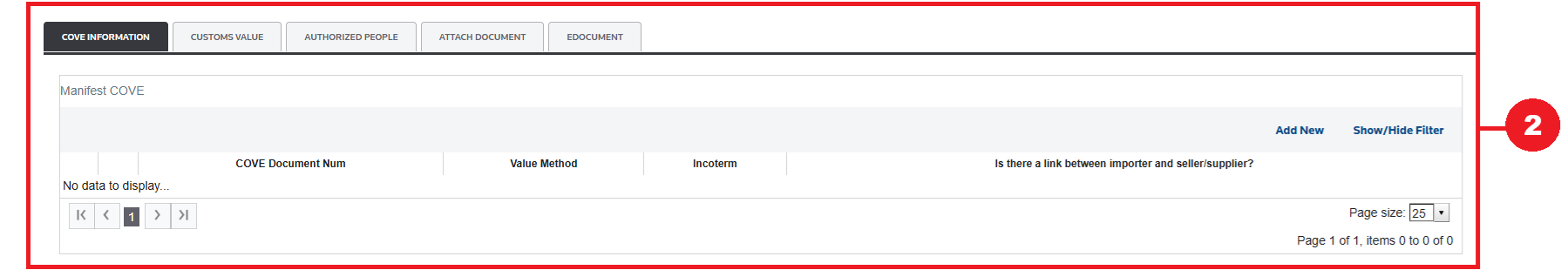 Section 2 contains the COVE data, customs value, authorized persons, files, e-documents, and the user activity log tab.