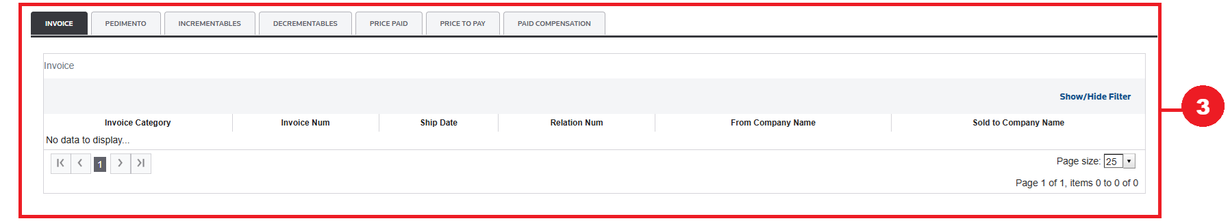 Section 3 contains all information about the documents (pedimentos and invoices) linked to the selected COVE and the declared values