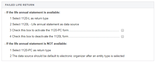 5. In the Failed Life Return section, select both checkboxes at the bottom of the screen. 1 checkbox turns off the 1120-L; the other turns on the 1120-PC area and the tax form. The failed life checkboxes are on the screen shown in the Organizer, then
