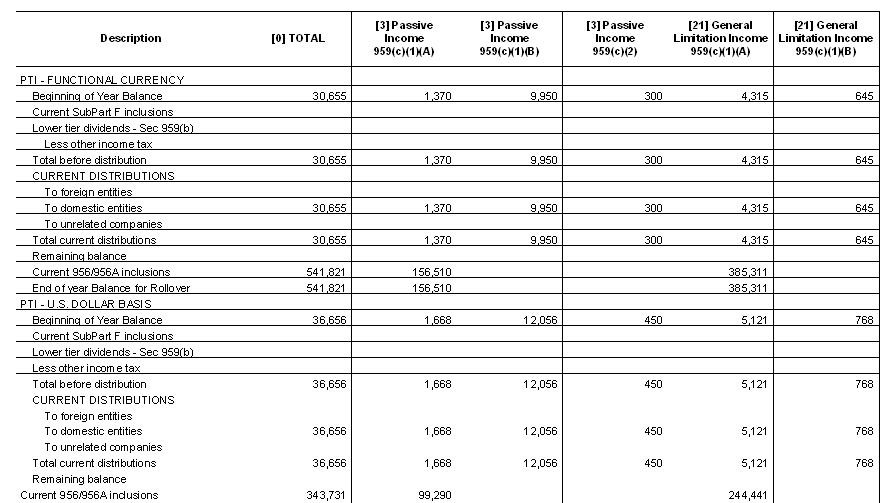 Post-86 and Pre-87 PTI Exchange Gain/Loss reports include a breakdown by 959(c) category of the functional currency and US Dollar Basis amounts that rollover to the subsequent year. However, since the by basket method does track additions and reductions at a separate category level, the ending US Dollar amount for each basket is prorated to the individual categories based on the functional currency values.