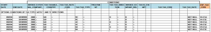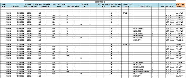 For the below sample the assumption has been made that the tax code should drive the rate and the tax treatment should be reflected in the account assignment key. Thereby a V1 is standard rate, V2 reduced rate etc. In this sample the “A” tax codes are output tax, the “Y” tax codes are used as override output tax codes. The “V” tax codes are input tax and the “Z” tax codes are used as override input tax codes. These are the single direction tax code assignments as opposed to those that require both an ‘I’ and ‘O’ direction like reverse charge, acquisition etc.