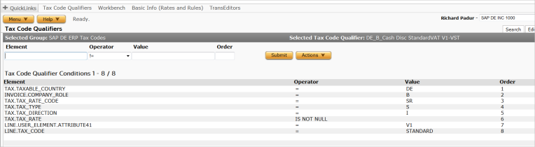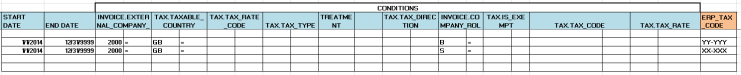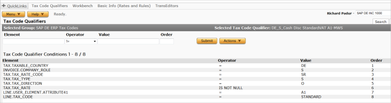 If you are using cash discounts at time of payment on any of your country configuration in SAP then you will need to address this step. Tax code qualifiers will need to be replicated in the TCQ table so that a “standard” Determination tax code condition with attribute 46 condition at the line level of “A1” would drive to an ERP Tax Code of A1-MWS. Likewise, the Attribute 46 of Y1 would drive to ERP tax code of Y1-MWS. You would need to set up an additional TCQ for each entry in the cash discount adjustment table. Each TCQ would be a mirror or your original but would have the additional conditions of tax_line_attribute41 = XX where XX would be the original tax code. It would also have a condition for the Determination tax code as it is used in the override tax code instructions. An example is shown below.