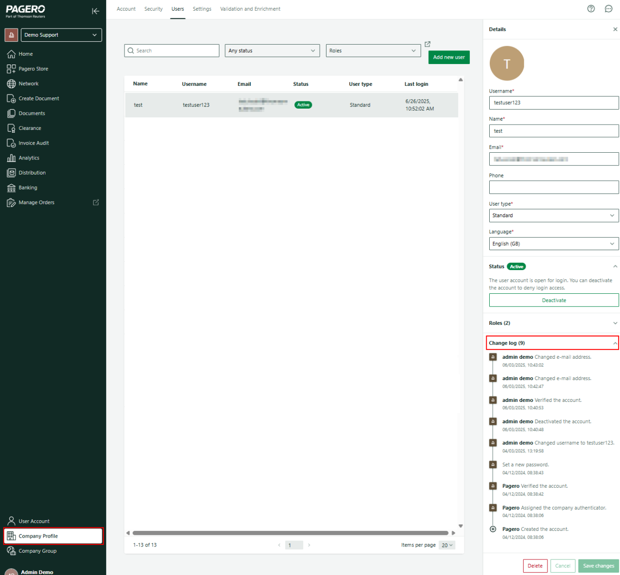 Pagero Online includes a feature where company's admin users can see the overview of users' login history. Naturally, passwords are not monitored. Instead, admin users can see if the user account has had failed login attempts and if the account has been locked. This feature helps admin users to stay up to date whenever company users face login problems.
