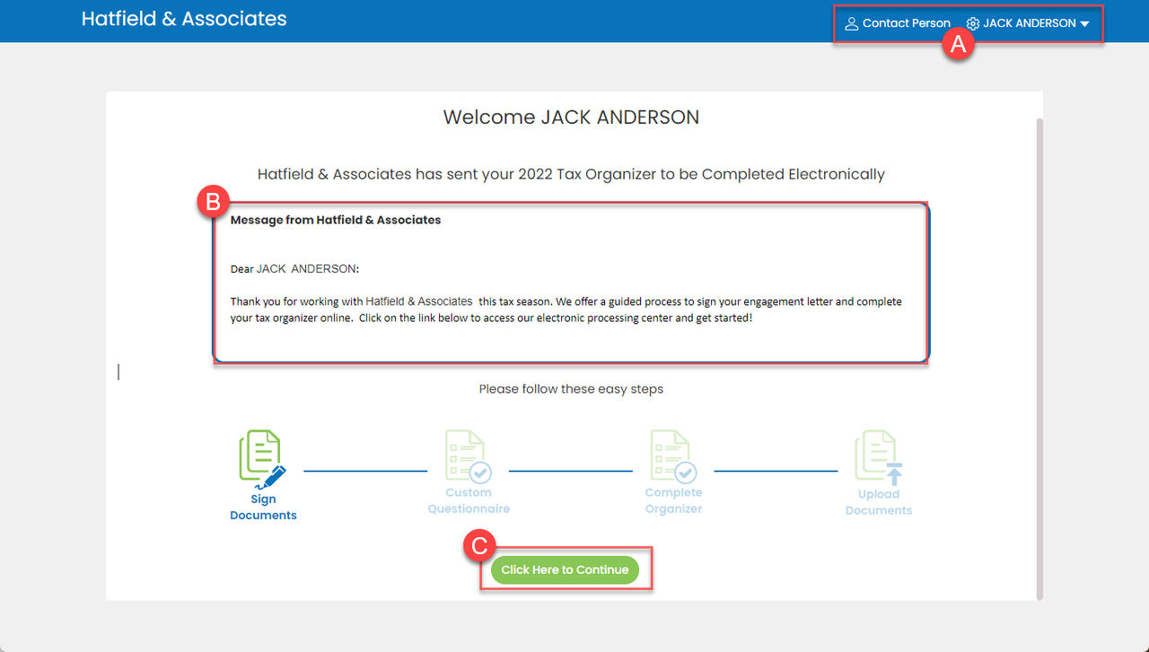 Select Save & Continue Later to be directed back to the Welcome Page.