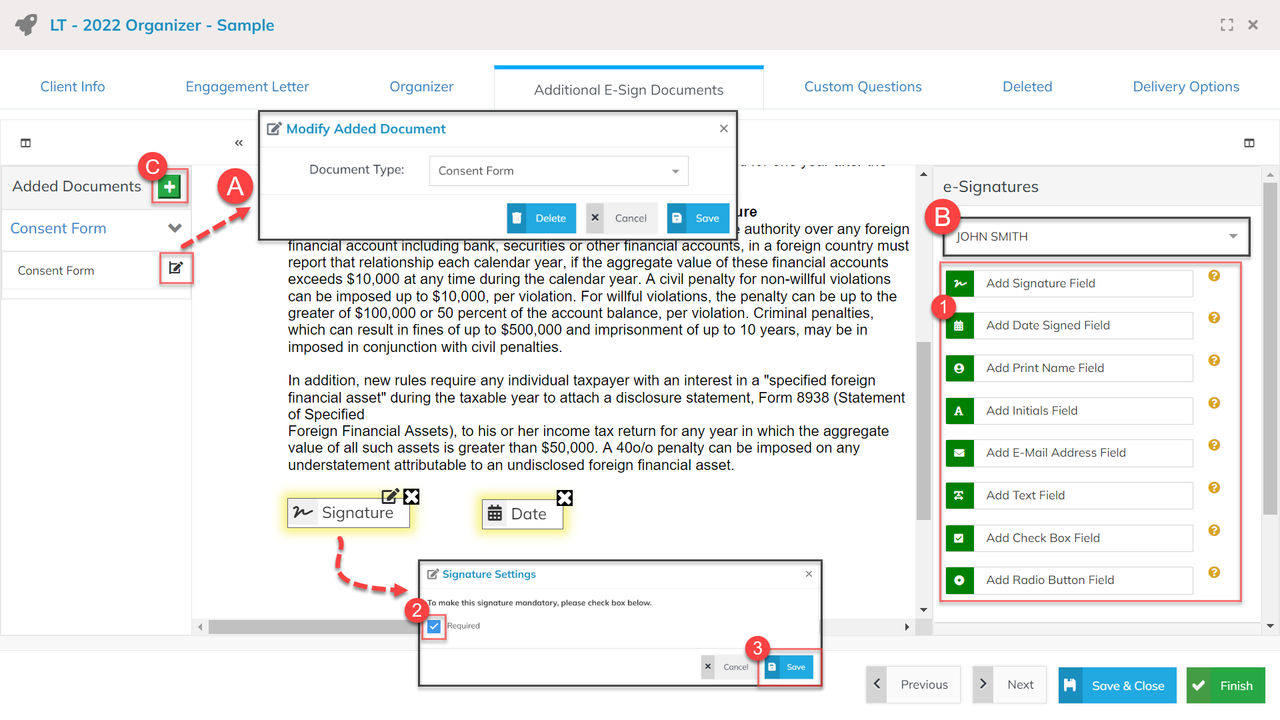 The Additional E-Sign Documents tab is used to manually add forms that were not included in the original return PDF that require a signature. This tab functions the same way as the Engagement Letter tab after documents are uploaded.