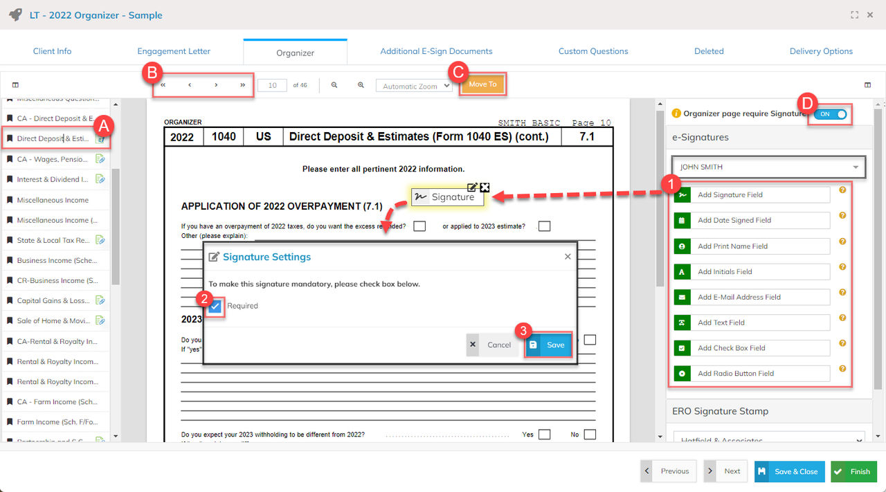 The Engagement Letter tab displays the full engagement letter uploaded with the organizer. Taxpayer and spouse signature blocks will need to be added to the page.