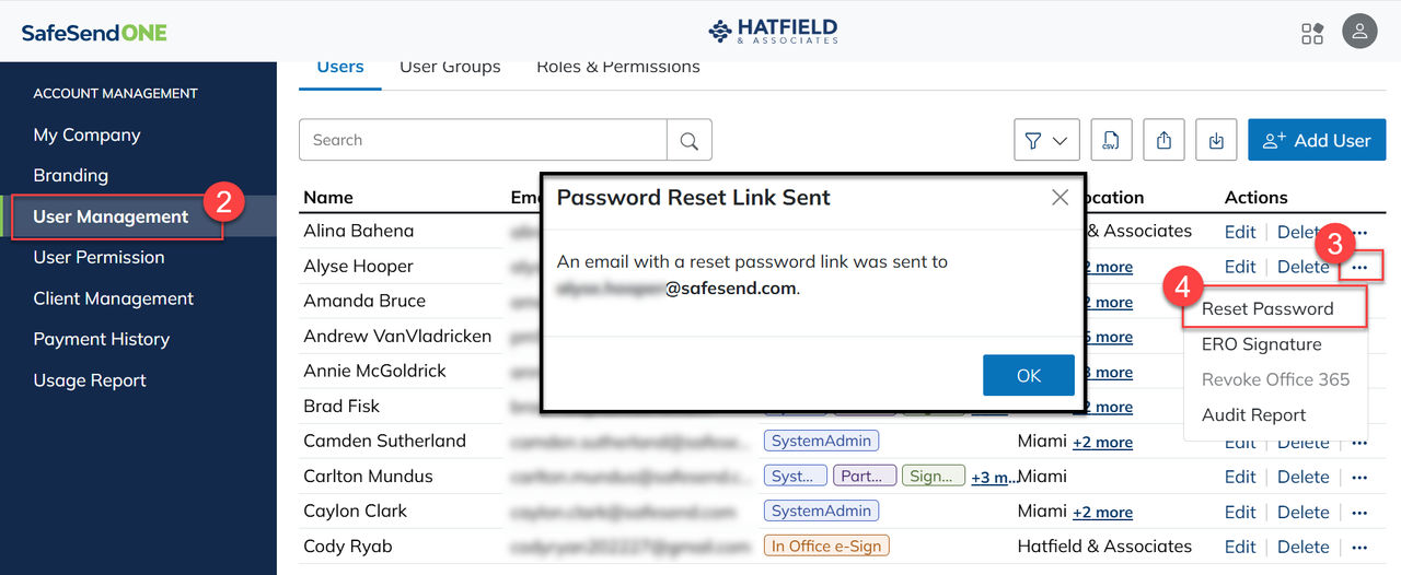 Administrators can send a password reset email to Staff, Partner, or Administrative users.