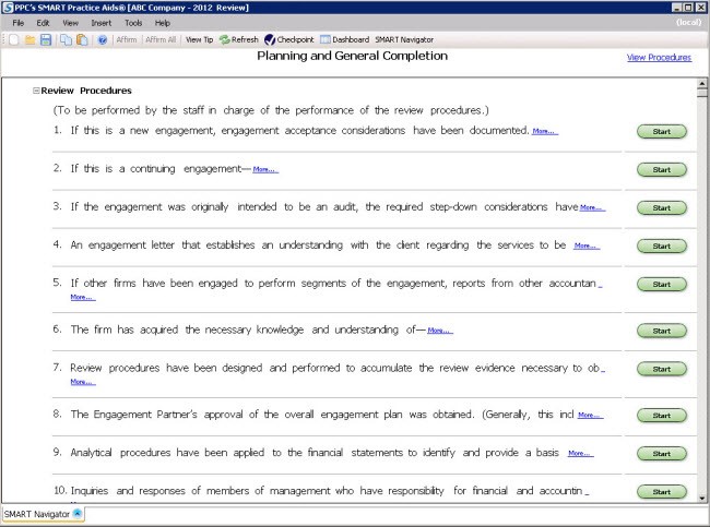 In addition to SMART Navigator, you can navigate your engagement through the left hand navigation pane or the tabs at the bottom of the screen. You can also navigate via the View Procedures link at the top of the screen.
