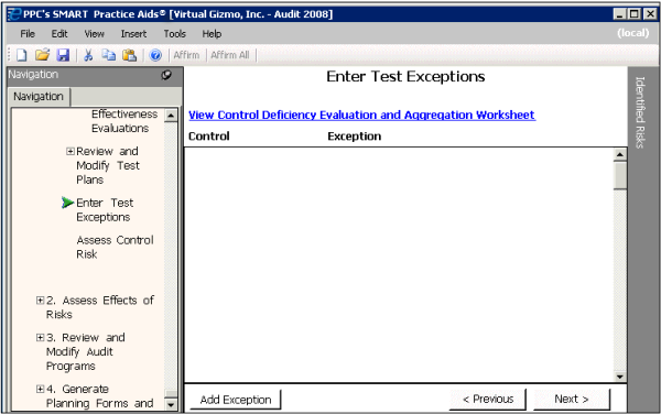 If exceptions or control deficiencies are noted during control testing, you enter them in the