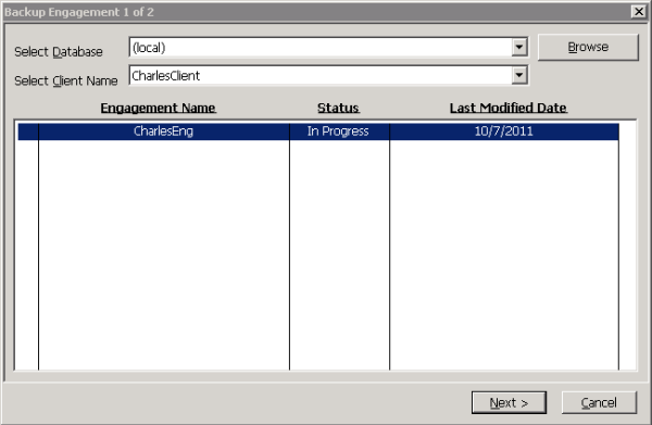 Use this window to back up a client engagement.