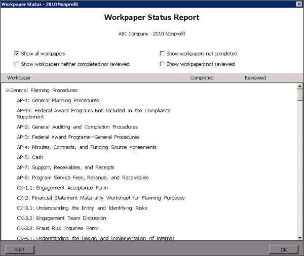 Use this report to view the status of workpapers, including the date completed and the date reviewed.