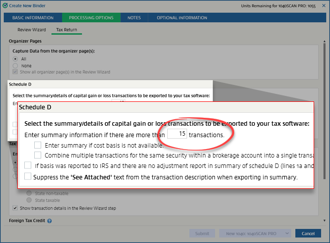. Summary information will always be captured. If there are 15 or fewer transactions in the whole return, details will be captured too (per the other selections described as follows). If there are more than 15 transactions in the return, only the summaries will be captured.
