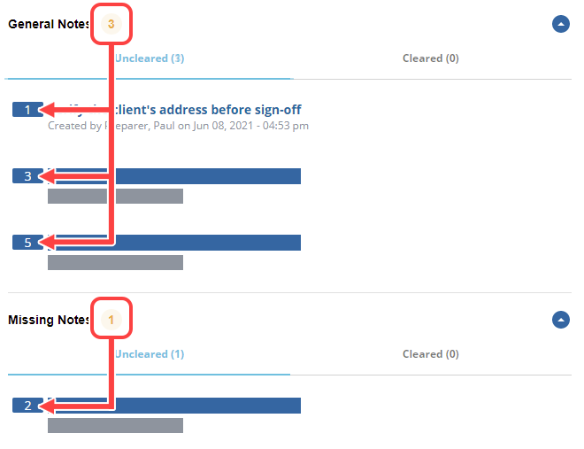 that indicates the number of uncleared notes in the client's binder for that specific category.