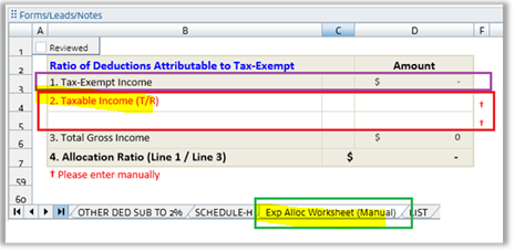 9. Ratio of Deductions Attributable to Tax-Exempt Income (“Exp Alloc Worksheet (Manual) sheet)"