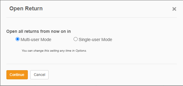 Live Sync On Hold | Open the tax return in GoSystem Tax RS and ensure that Multi-user Mode is selected. | The tax return is restricted to a single user at a time. You need to select Multi-user Mode when the tax return opens. ![]() |