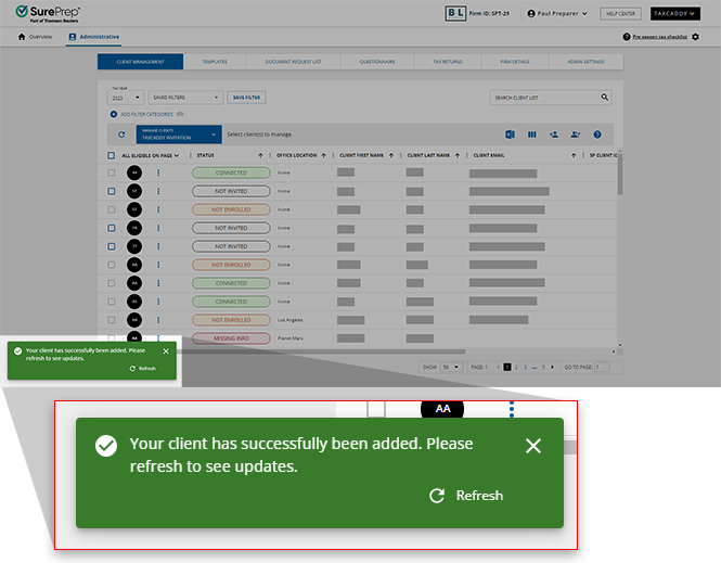 . Client's with missing mobile phone number or SSN will be able to log into TaxCaddy, however, your firm users will need to make sure their identity before you and your clients can see each other's documents, requests, and activities.