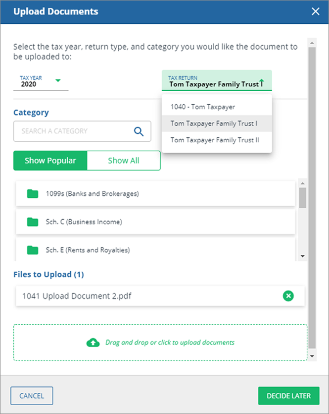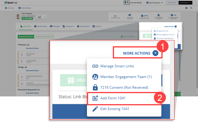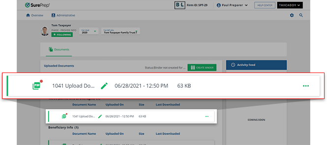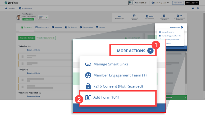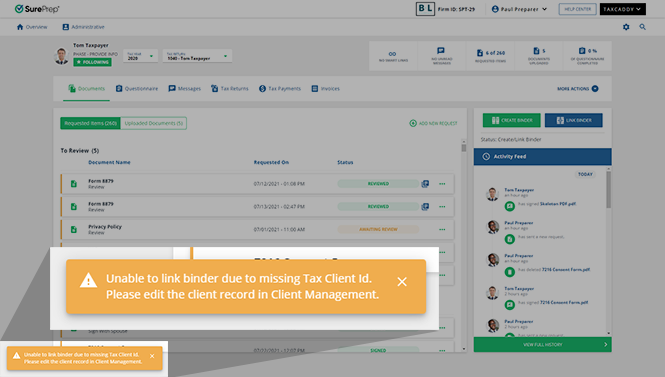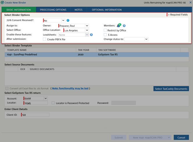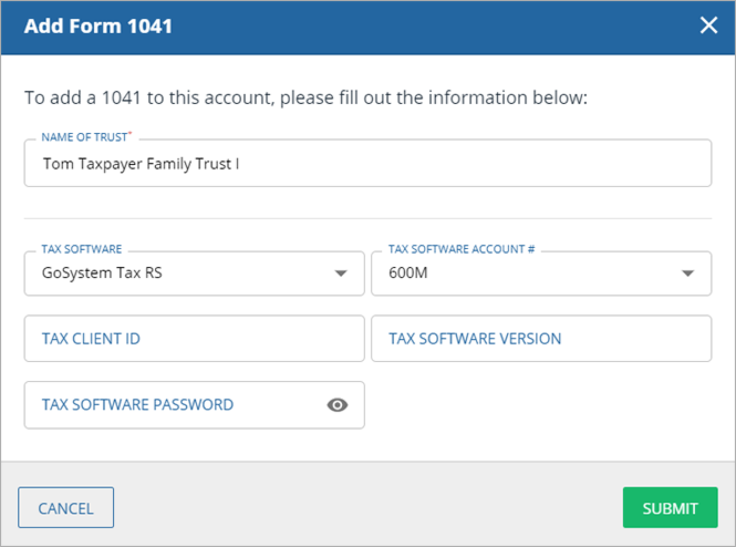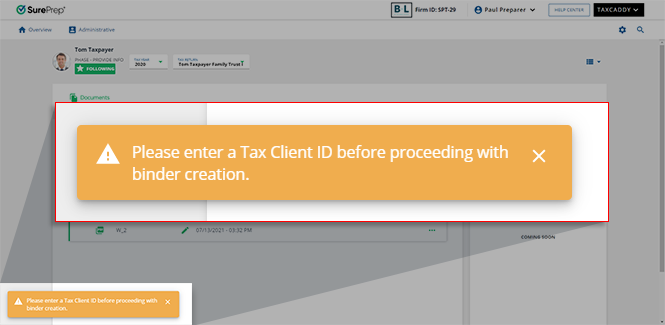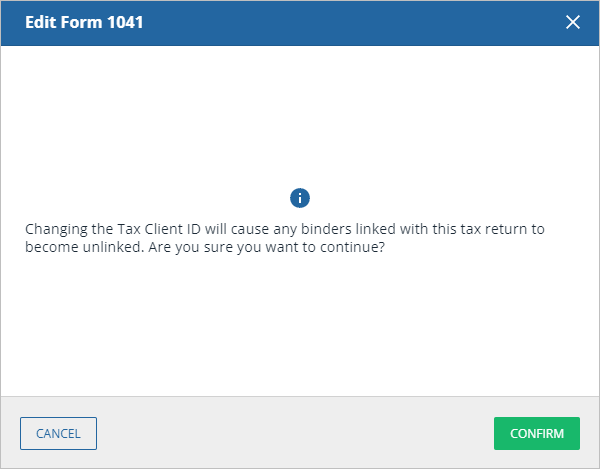 Tax Client ID | Enter your client's ID from the tax application. Make sure to enter the client ID linked to your 1041 account in the tax application. * Tax Client ID is required to create a new binder in TaxCaddy. You won’t be able to create a new 1041 binder if the Tax Client ID is blank/missing. |