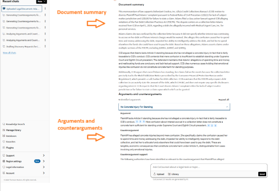 Users can now quickly identify weaknesses in opposing arguments and develop stronger counter-positions with the new arguments and counterarguments skill. Leveraging Westlaw Advantage’s Litigation Document Analyzer, the new skill will summarize and extract the arguments, generate potential counterarguments, and provide legal insights grounded in Westlaw content for each counterargument, greatly reducing response preparation time.