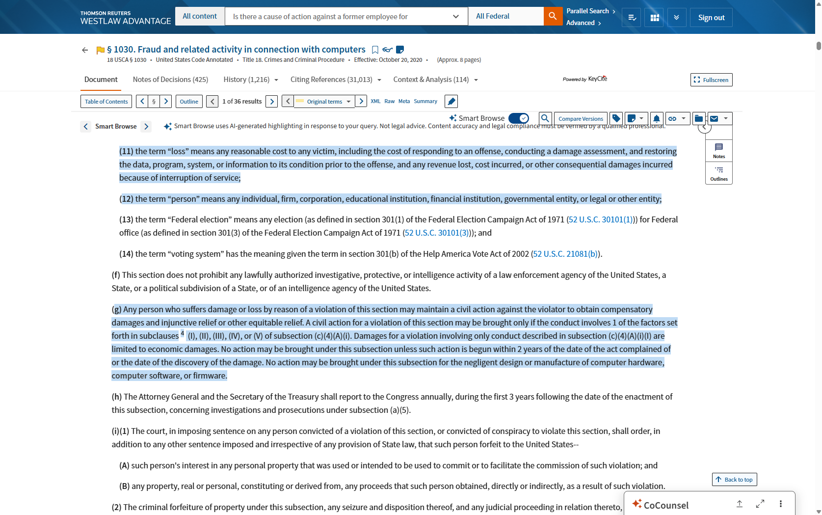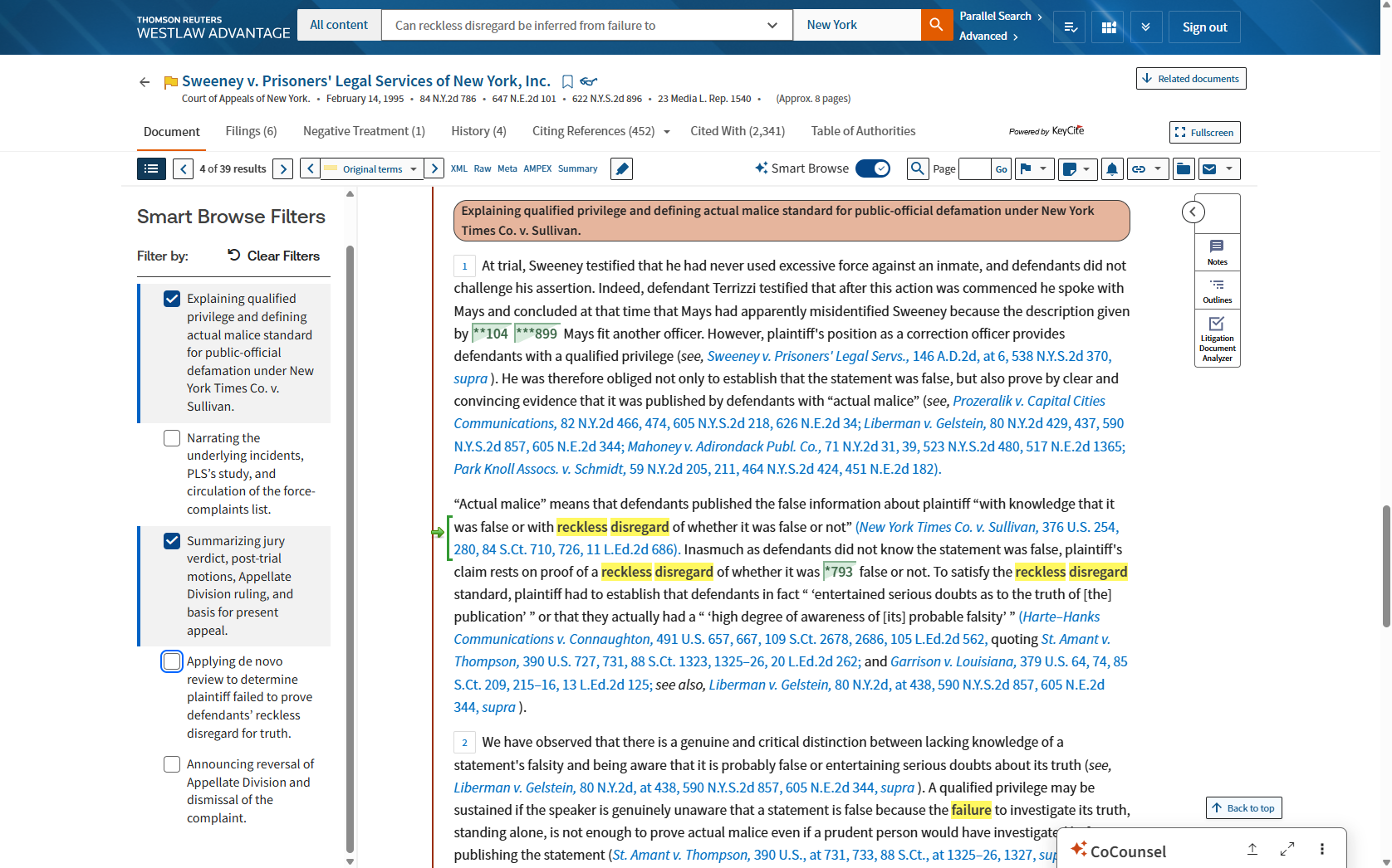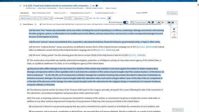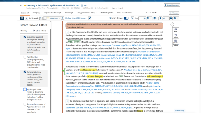 Smart Browse automatically highlights the most relevant portions of case law and statutory materials based on your research purpose. Enabling faster case prep and reducing information overload, it cuts through noise and elevates what matters most, helping legal professionals save significant time scanning long documents while improving research precision.