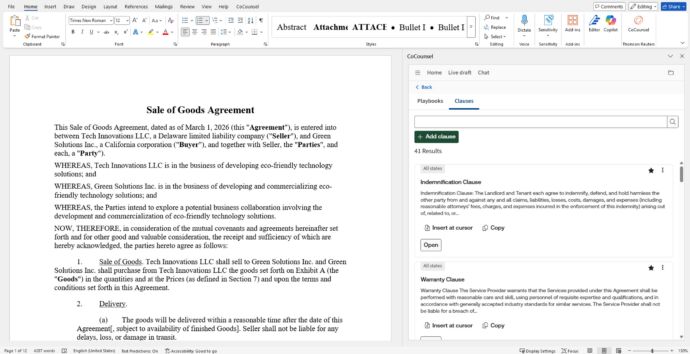 Using the new My Clauses in CoCounsel (U.S.), transactional lawyers can build a personal, searchable library of preferred contract provisions saved from playbooks, draft and modify outputs, or added manually so the right language is always within reach. Find what is needed in seconds, tailor it to the specific matter, and reuse it instantly across new agreements. That means less time hunting through old files, fewer drafting interruptions, more consistency across matters, and faster turnaround from first draft to final.
