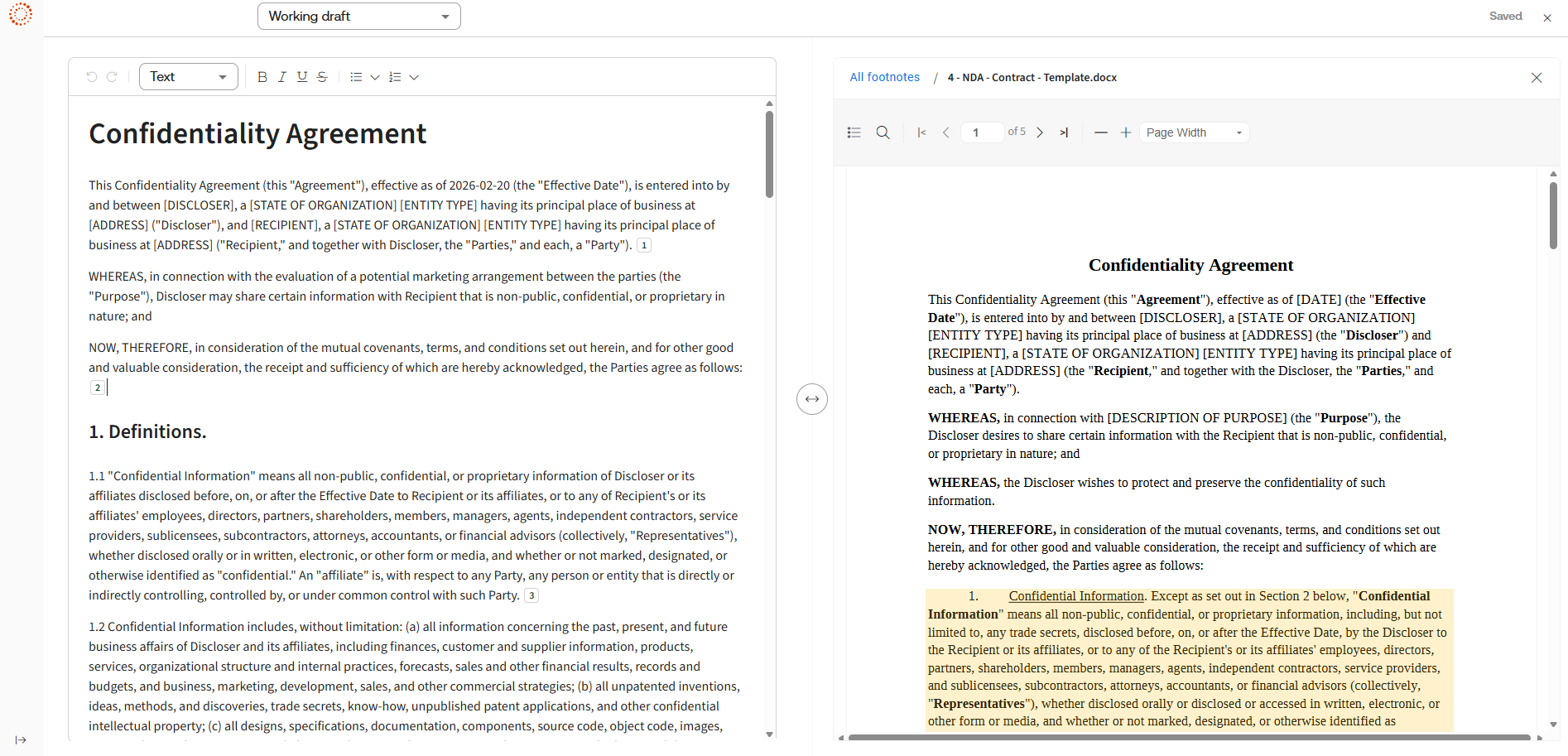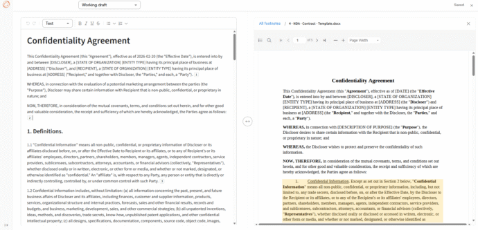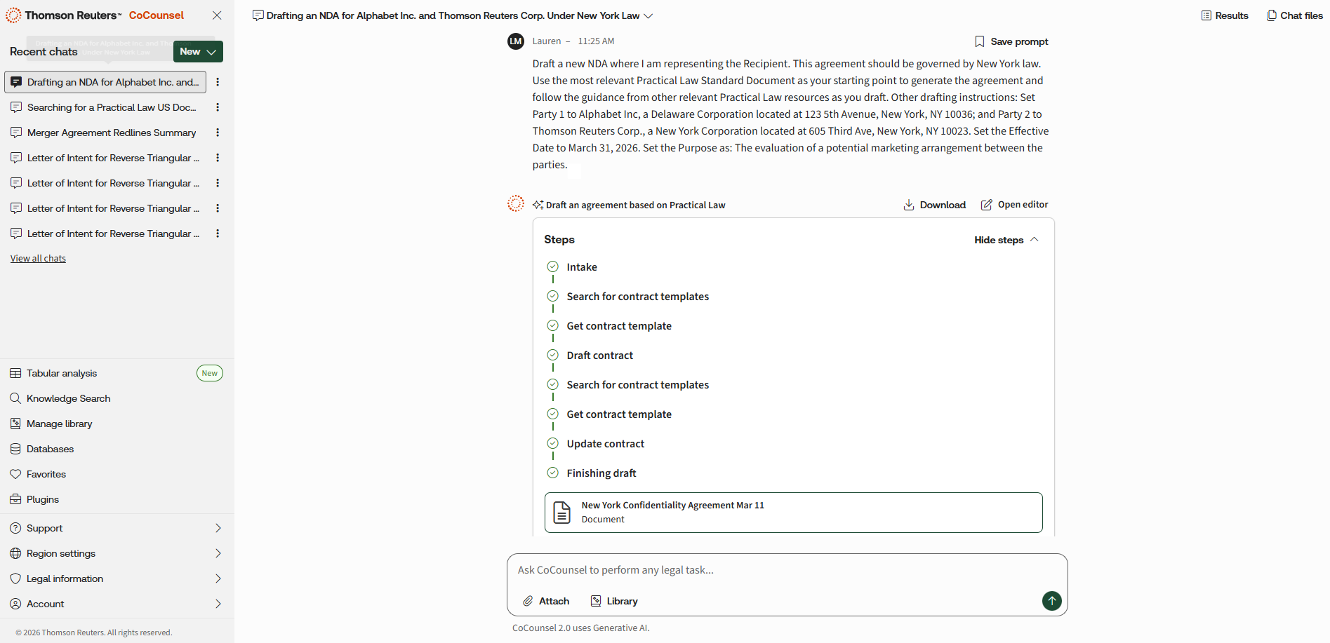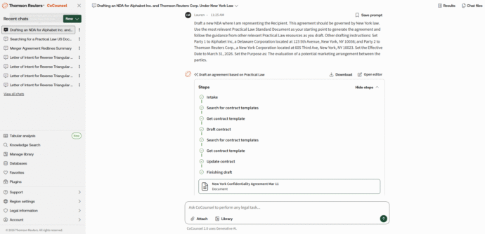 Draft agreements faster without starting from scratch as CoCounsel’s drafting agent enables U.S. users to generate a comprehensive first draft in minutes using a trusted precedent or a Practical Law Standard Document. Simply upload source material, add key details and requirements, and CoCounsel analyzes the template, applies its structure and style, and produces a tailored multi‑page draft aligned to the instructions provided. The result is a quicker path from blank page to a client-ready draft in a streamlined workflow with less manual assembly allowing users to spend more time reviewing, negotiating, and advising. Review and then export to Microsoft Word when ready.
