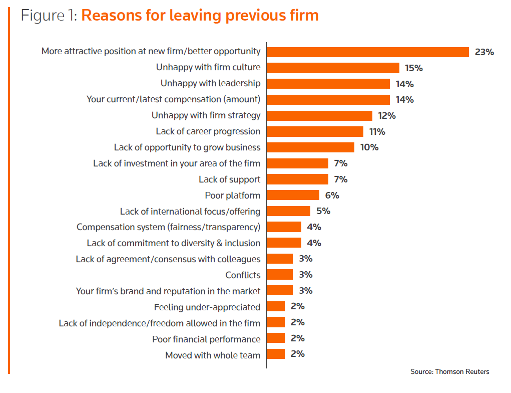 Of course, each lawyer will have their own deeply personal reasons for making such a switch, yet our research does uncover a number of common reasons offered by those who do leave. Indeed, one of the most common reasons for leaving a firm is simply that the lawyer received a better offer elsewhere, indicating interestingly, that many lateral hires were not looking for a new position when they were approached by the firms to which they eventually moved.