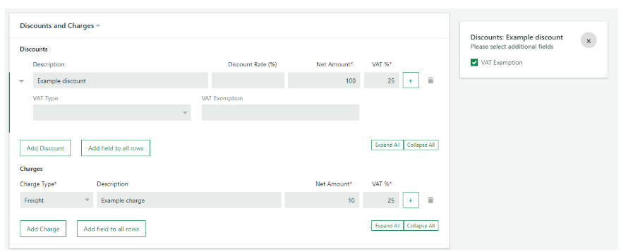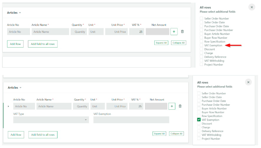 W powyższym przypadku konieczne jest wybranie pola Zwolnienie z VAT dla wszystkich wierszy poprzez skorzystanie z przycisku
