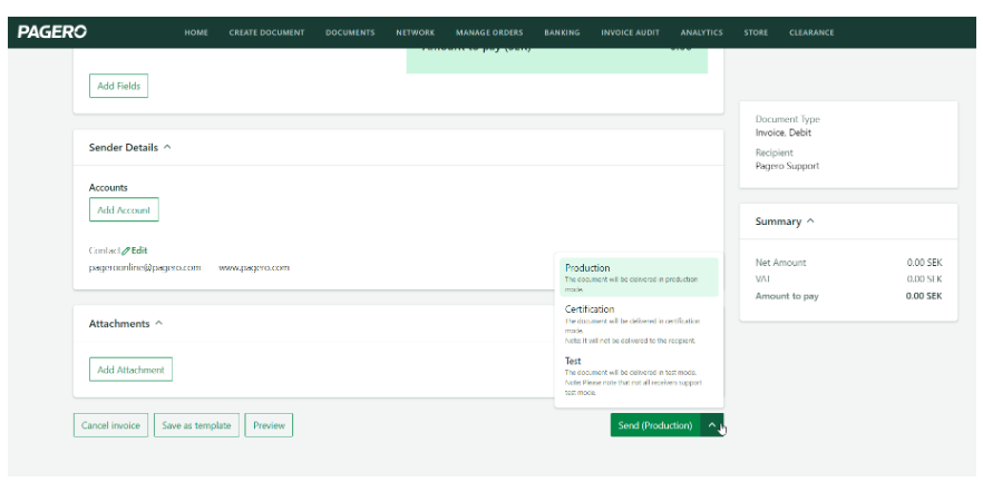 - Tryb certyfikacji, służący do potwierdzenia ustawień technicznych, testowania formatów, umów, połączeń routingu, problemów i innych elementów. Faktury przesłane w tym trybie nie zostaną dostarczone do klienta, ale przejdą wszystkie etapy przetwarzania w obiegu dokumentów Pagero Online, co daje dodatkową elastyczność. Jest to po prostu sposób przesłania faktury testowej, która nie trafi jeszcze do odbiorcy